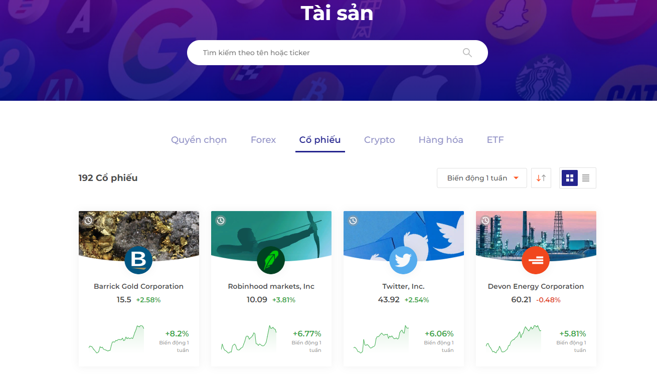 Phần lớn nhất của tài sản là cổ phần của các công ty toàn cầu. Tổng cộng có 188 cổ phiếu ngày hôm nay - Amazon, Tesla, Netflix, Adidas, United Airlines Holdings, Heineken và những cổ phiếu khác. Chọn bất kỳ và mở giao dịch đầu tiên ngay hôm nay! Sử dụng tài khoản demo để kiểm tra nền tảng miễn phí.
