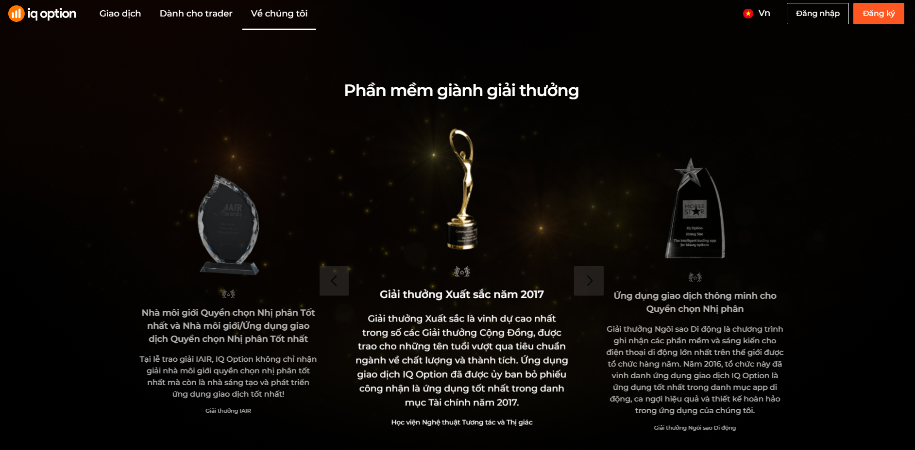 IQ Option đã giành được nhiều giải thưởng do ứng dụng giao dịch xuất sắc, nhiều công cụ giao dịch và thực hiện giao dịch ấn tượng. Trong số rất nhiều giải thưởng mà họ đã nhận được, ba giải thưởng danh giá nhất là: Giải thưởng Người xuất sắc năm 2017, Ứng dụng công nghệ tốt nhất và Nền tảng giao dịch di động tốt nhất.