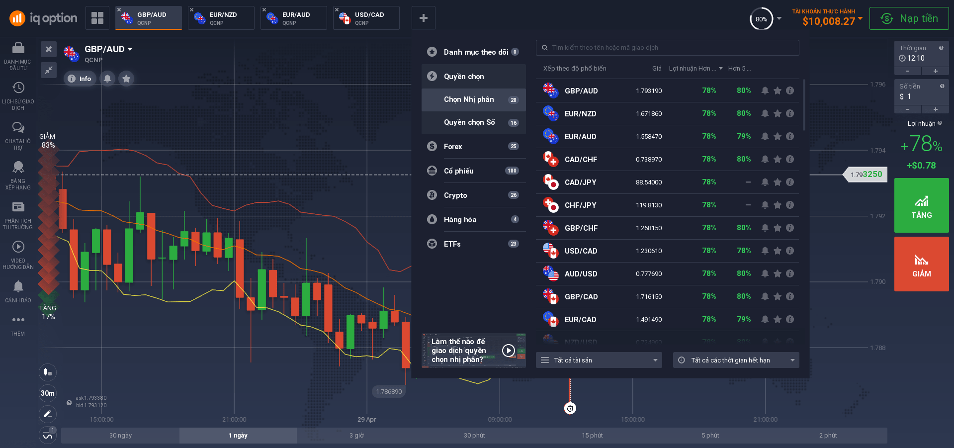 Bản chất của các tùy chọn nhị phân là bạn chọn tài sản cơ bản trong số những tài sản được cung cấp. Sau đó, xóa dự báo nếu giá trị của nó tăng hoặc giảm sau một khoảng thời gian nhất định và mở giao dịch với số tiền bạn cần từ $1. Tỷ lệ phần trăm lợi nhuận trên quyền chọn nhị phân thường là 75%-95% số tiền giao dịch. Nếu dự đoán của bạn là chính xác vào thời điểm giao dịch hết hạn, bạn sẽ nhận lại được $1 và lợi nhuận của mình. Giao dịch quyền chọn nhị phân phổ biến vì tính đơn giản của nó. Mọi người sẽ có thể giao dịch với công cụ này. Thật đơn giản, đó là lý do tại sao các nhà giao dịch yêu thích công cụ này đến vậy. Bạn có thể dùng thử miễn phí, hãy đăng ký và kiểm tra nó!