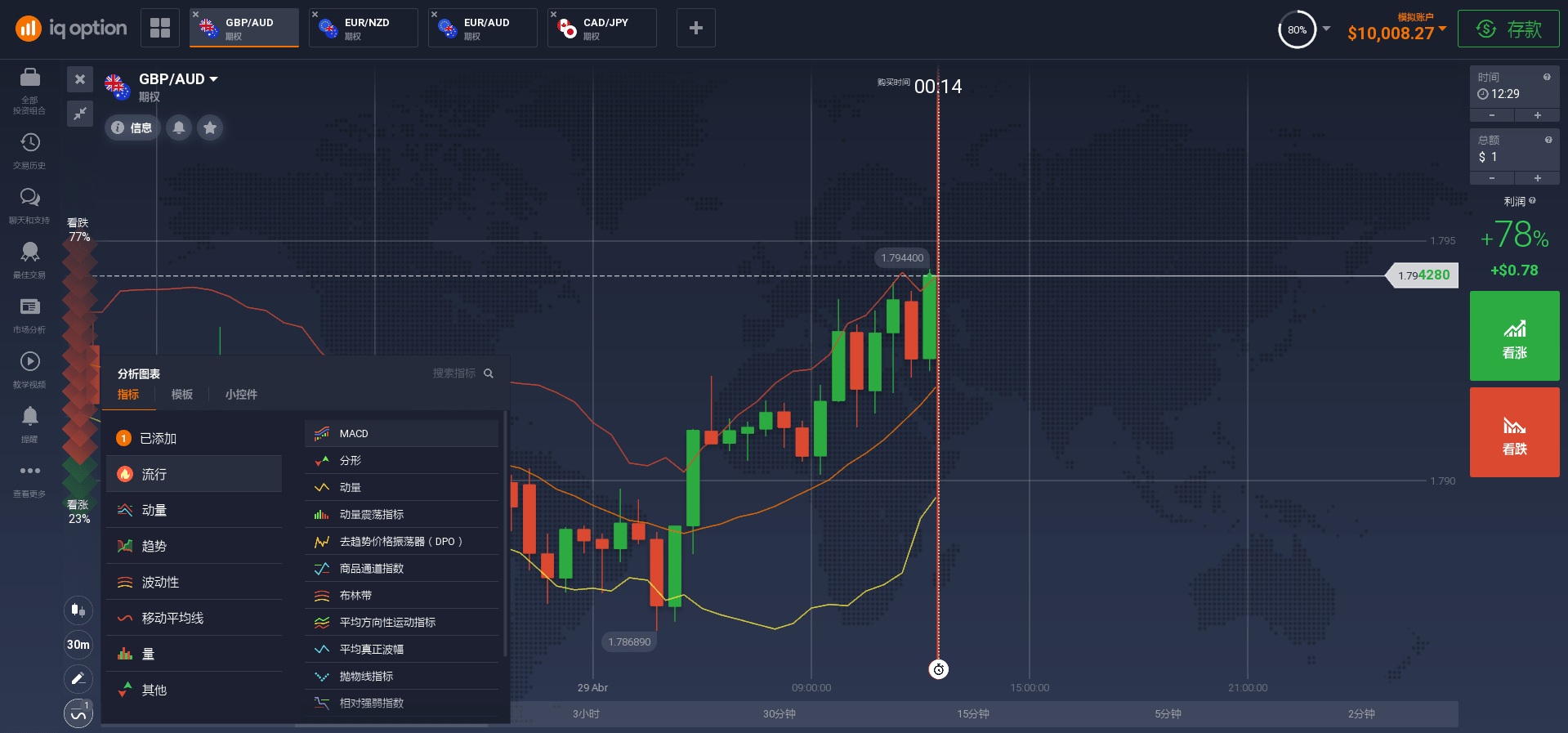 Nền tảng IQ Option cung cấp cho người dùng các công cụ phân tích và dự báo thị trường trực tuyến như biểu đồ và chỉ báo giao dịch. Bạn có thể theo dõi thị trường đang di chuyển ở đâu và nó có thể ảnh hưởng đến giá như thế nào bằng cách sử dụng các công cụ biểu đồ. Bạn thậm chí có thể tùy chỉnh các biểu đồ của mình dựa trên các chiến lược và dự báo cá nhân của mình và lưu mẫu chỉ báo. Điều này rất dễ dàng và đơn giản để làm. Bạn có thể truy cập nó trên bất kỳ nội dung nào trong tab "Mẫu".