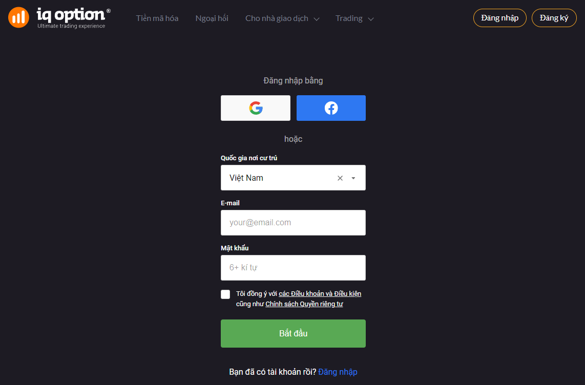 Đầu tiên, điều đầu tiên bạn cần làm là đăng ký trên trang web. Bạn có thể làm điều đó miễn phí, theo liên kết đến biểu mẫu chính thức, điền vào và bắt đầu hẹn hò. Bản thân việc đăng ký không bắt buộc bạn phải thực hiện giao dịch, kiểm tra nền tảng, xem giao diện và chức năng. Tuy nhiên, nếu bạn thực sự nghiêm túc, rất có thể bạn sẽ hài lòng và gắn bó lâu dài với nhà môi giới. Để biết thêm thông tin chi tiết, bạn có thể đọc bài viết này để được hướng dẫn về xác thực và đăng ký tài khoản cho IQ Option.