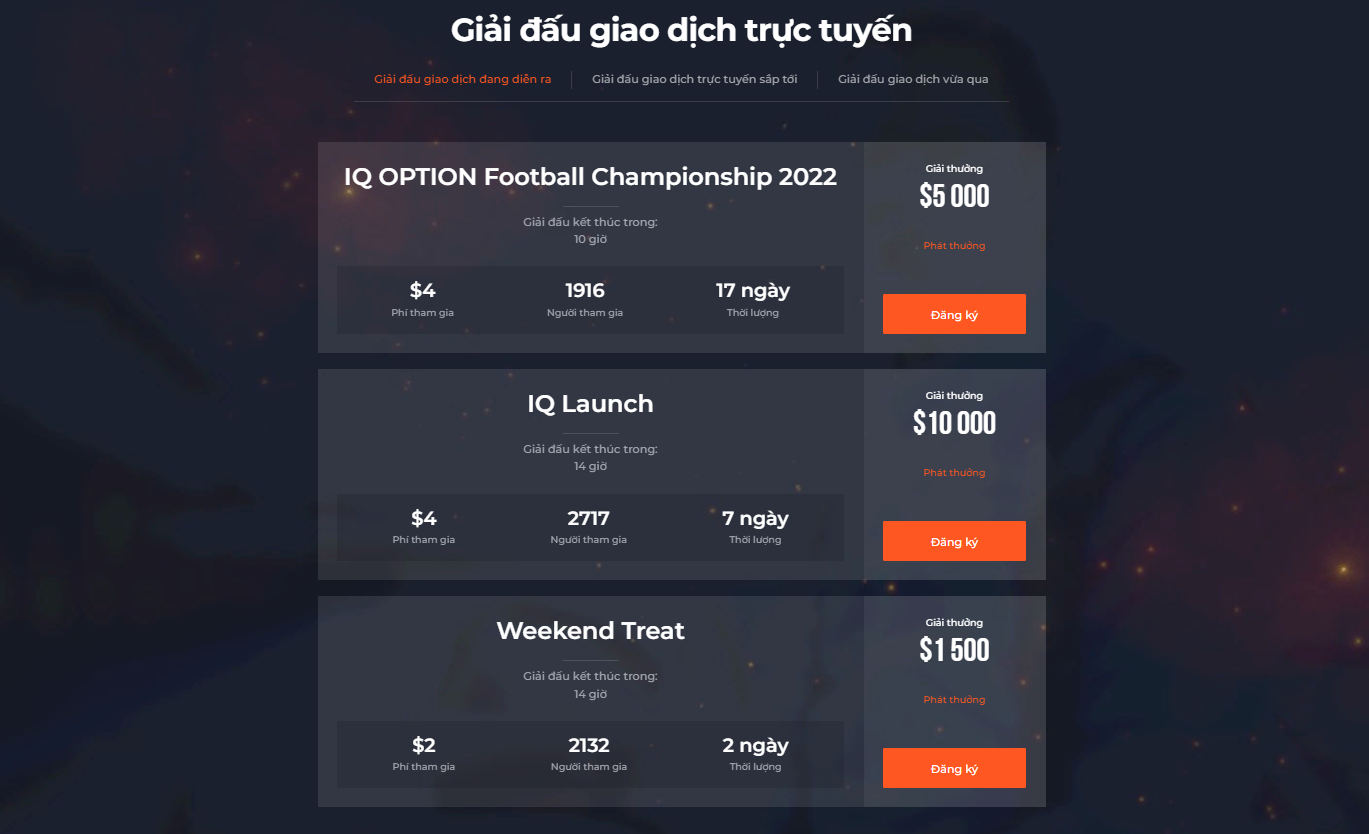 Ngày nay, công ty có rất nhiều giải đấu trong kho vũ khí của mình. Các giải đấu IQ Option - cơ hội tham gia các cuộc thi với nhiều điều kiện khác nhau. Ngưỡng tham gia trong trường hợp này chỉ là hai đô la và quỹ giải thưởng có thể lên tới 50 nghìn đô la. Điều kiện tham gia thường đơn giản và liên quan đến giao dịch.