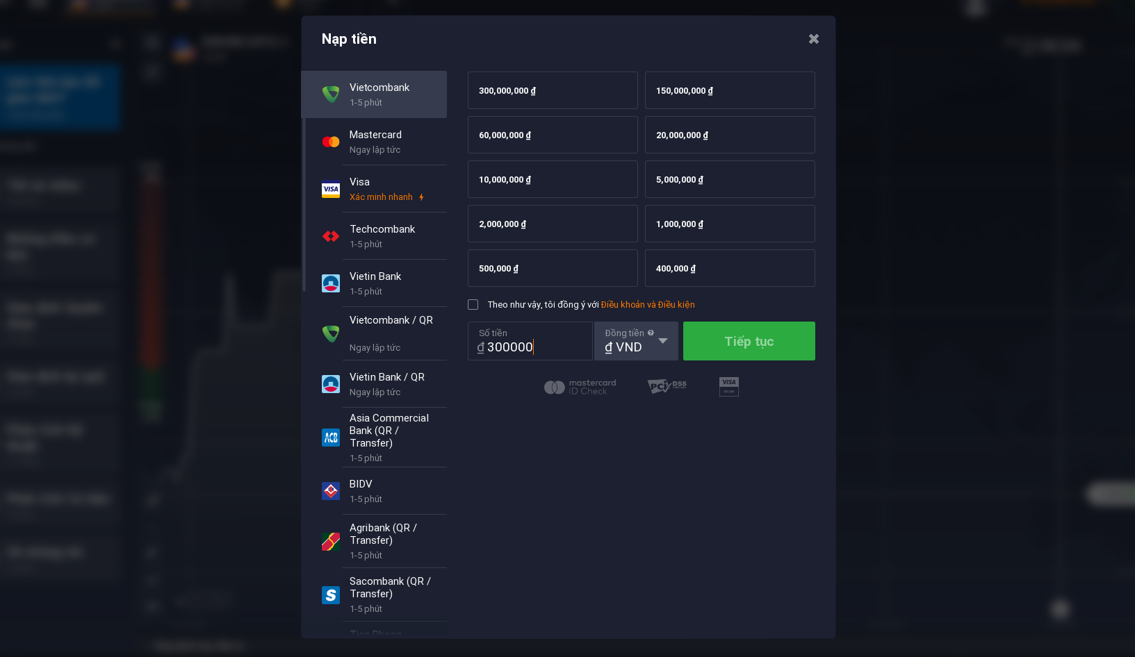 Bạn có thể nạp tiền vào tài khoản của mình bằng một số loại tiền tệ được hỗ trợ: VND, USD, EUR, GBP. Xin lưu ý rằng bạn chỉ có thể thay đổi đơn vị tiền tệ của tài khoản IQ Option một lần trong lần nạp tiền đầu tiên.