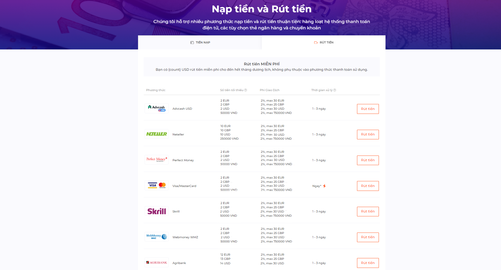 - Hạn mức rút tiền tối thiểu: 2USD,